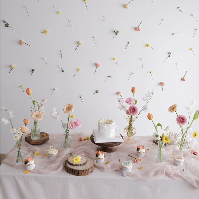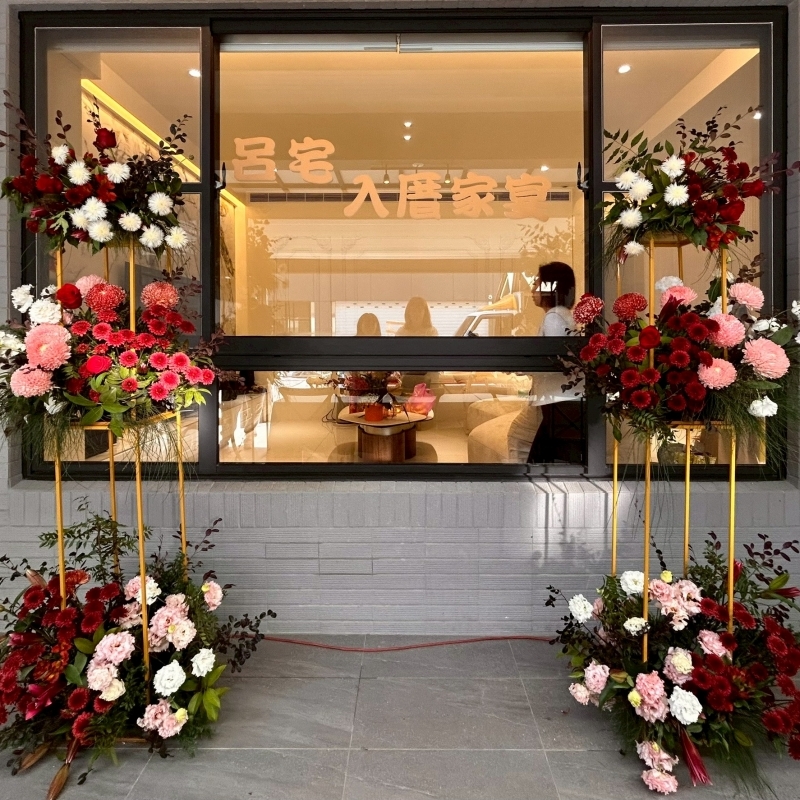 以紅、白、粉色系花藝佈置入厝空間,融合喜氣與柔美氛圍,象徵幸福圓滿、生活甜美,為新家開啟美好篇章。